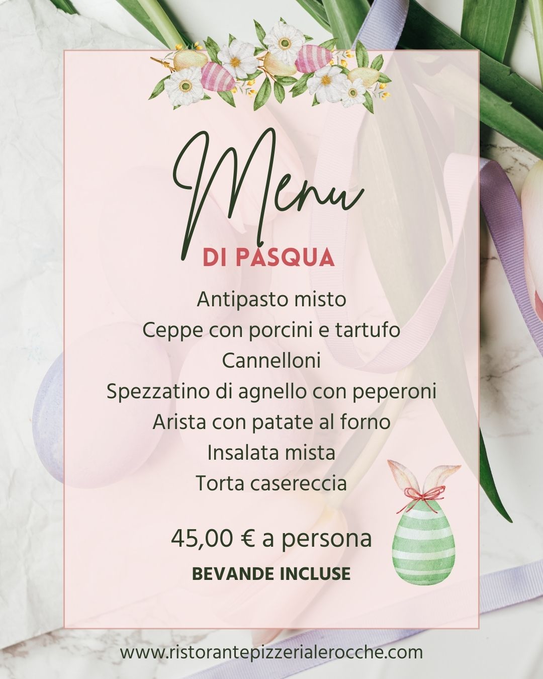 Festeggia la Pasqua con un menu speciale, preparato con cura e tradizione. Un pranzo da condividere con chi ami, in un’atmosfera calda e familiare. Prenotazioni aperte: riserva subito il tuo tavolo.